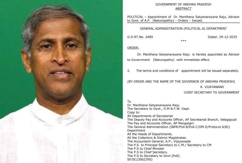 ప్రముఖ ప్రకృతి వైద్య రంగ నిపుణులు డా. మంతెన సత్యనారాయణ రాజును ఆంధ్రప్రదేశ్ ప్రభుత్వానికి ప్రకృతి వైద్య సలహాదారుగా (Advisor – Naturopathy) నియమిస్తూ ప్రభుత్వం ఉత్తర్వులు జారీ చేసింది. ప్రకృతి వైద్య విధానాలను ప్రజలకు మరింత చేరువ చేయడం, ఆరోగ్య జీవన విధానాలపై అవగాహన పెంపొందించడం, ప్రభుత్వ ఆరోగ్య కార్యక్రమాలకు మార్గదర్శనం చేయడం లక్ష్యంగా ఈ నియామకం చేపట్టినట్లు అధికారులు తెలిపారు.